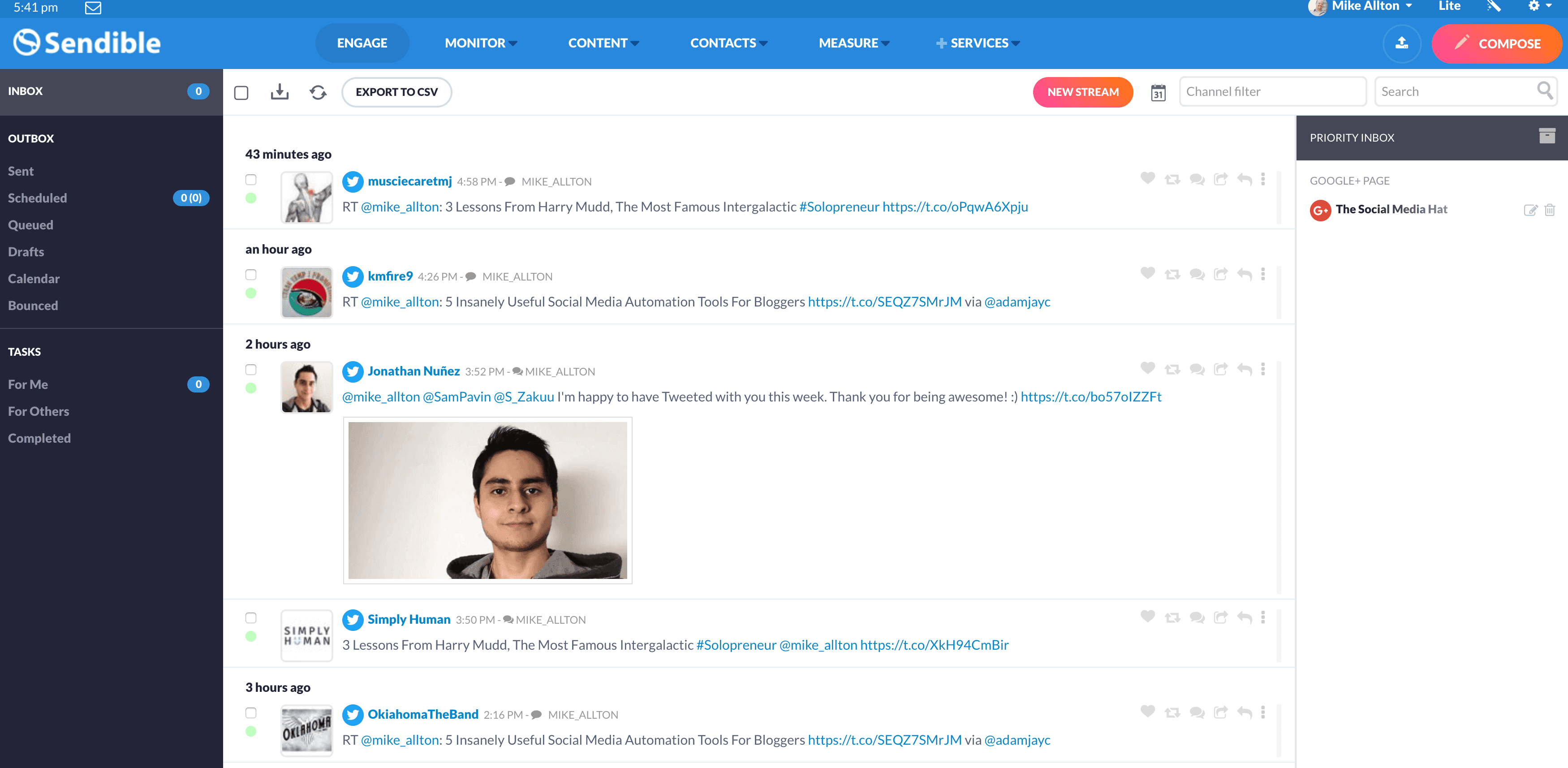 The Sendible method for listening is to split it into two areas: Engage & Monitor. Engage includes your normal replies and mentions, and is a single inbox for all connected profiles.
