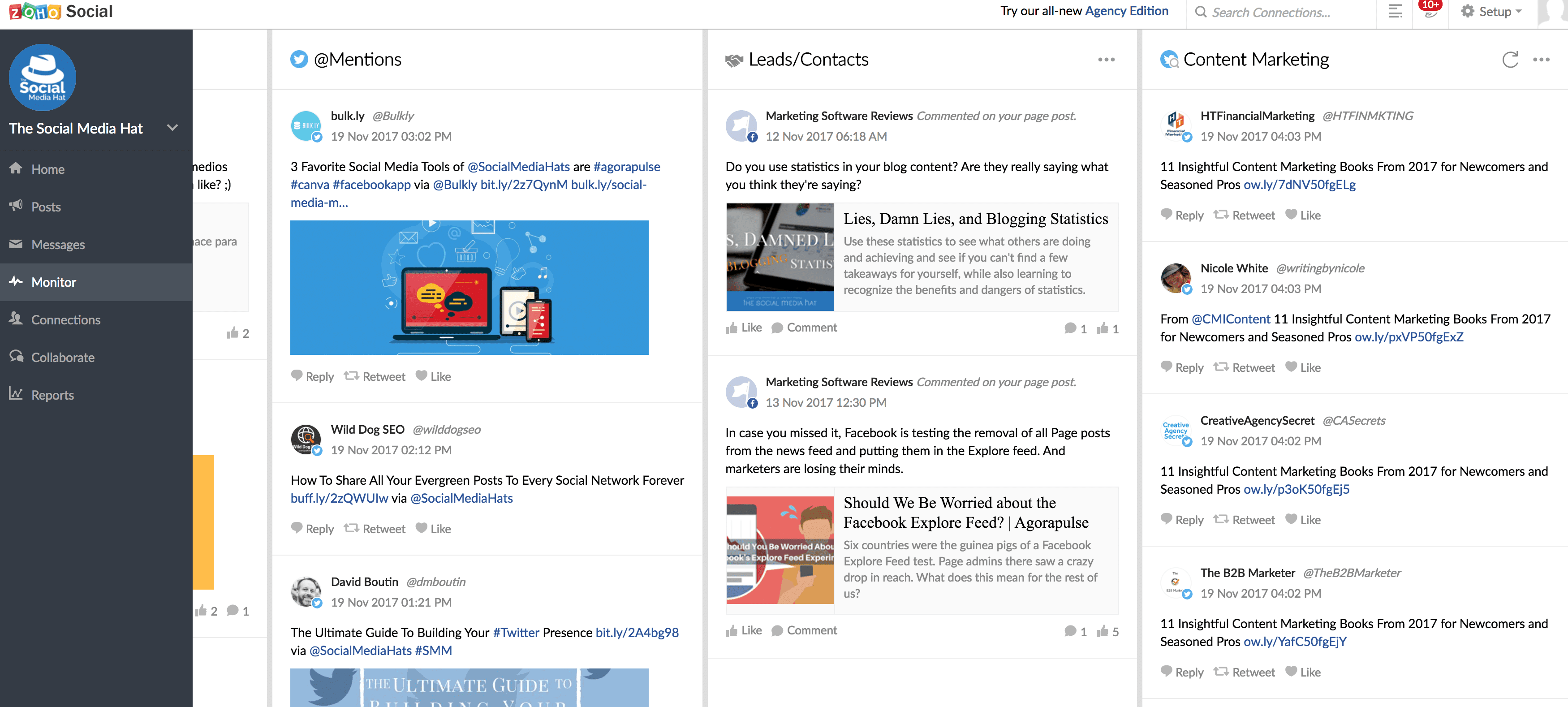 Finally, the Zoho Social method for listening utilizes a dashboard approach. You can add columns to the Monitor tab for a variety of purposes.