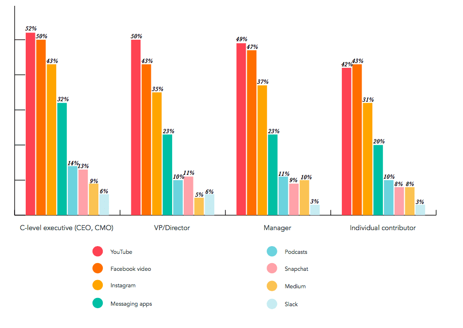 Although video remains a big disruptor, Youtube remains the top content distributional channel to add into a marketing strategy (49-52%), within the next 12 months, from senior level positions. Facebook video follows closely behind (43-50%), with individual respondents believing this is more important than Youtube.
